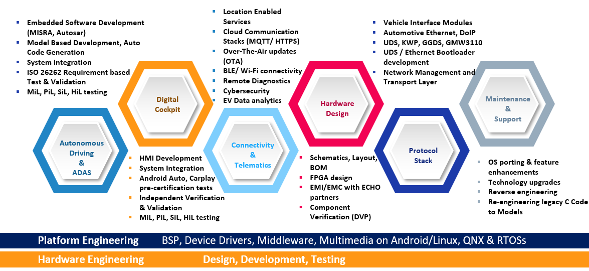 We work on technologies and tools include microcontrollers, microprocessors, real-time operating systems (RTOS), programming languages like Embedded C, C++, AUTOSAR (Classic & Adaptive), QT, QML, HMI, MATLAB and hardware design tools like Altium Designer and Cadence Allegro.